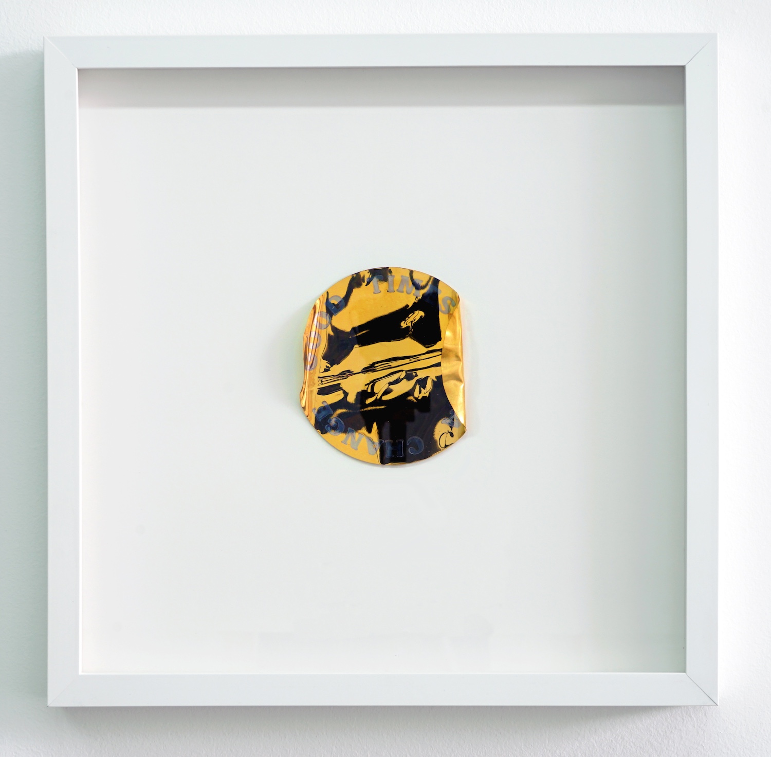 Mirror, glass, vinyl and paper stickers, broken bottle glass, wood frames, aluminium handrail with engraving