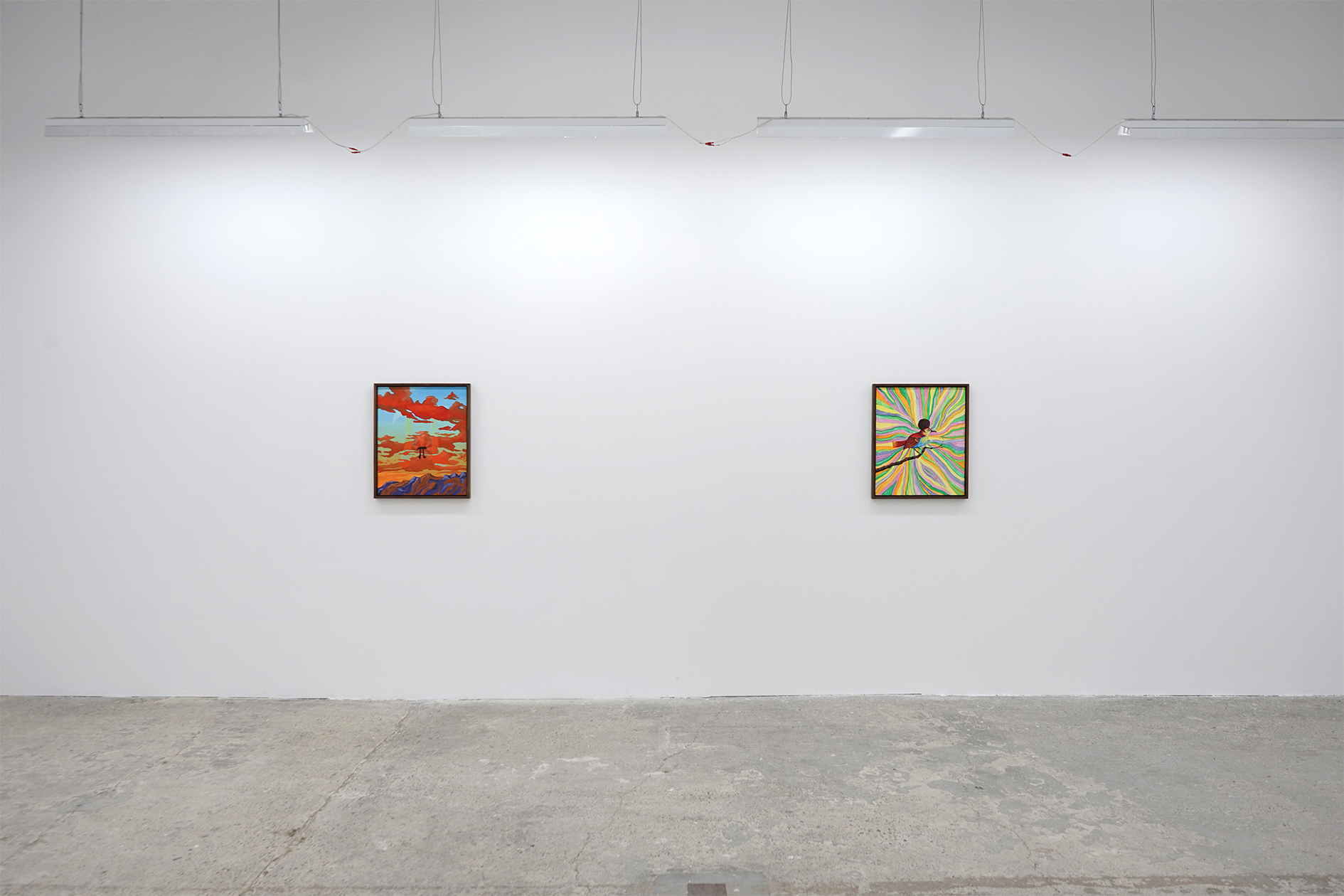 The exhibition opens with four colored-paper drawings, each defined by sharp oil pastel lines. While the drawings explore different motifs, they are linked by a recurring theme: the Sisyphean effort to quit smoking, a habit that resurfaces in various imagined scenarios. This exploration of human compulsions and the subconscious continues in the main room, where seven acrylic paintings on wooden panels are displayed. Drawing on art history, literature, pop culture, and motifs from his earlier work, the paintings bring together diverse influences into composed, engaging scenes, whether viewers recognize Goya’s Still Life, Sumerian figurines, or neither.