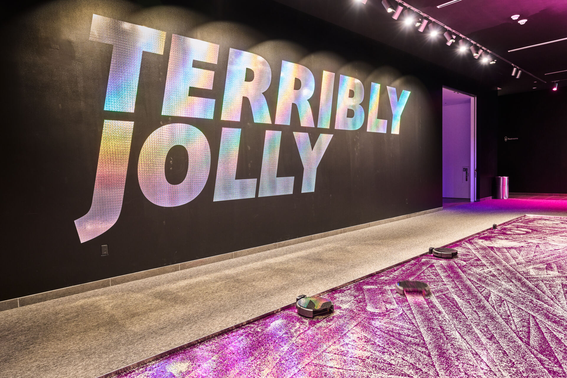 The exhibition concludes with the glimmering chaos of the after-party. In Puff Out, :mentalKLINIK (Yasemin Baydar and Birol Demir, a Brussels-based artist duo from Istanbul) unleash a fleet of robotic vacuum cleaners that roam a glitter-covered space, drawing in and redistributing the glitter as they go. These machines animate the room with playful unpredictability. The pair’s additional architectural interventions within the museum extend the spirit of the rave —immersive, collective, and playfully unruly.